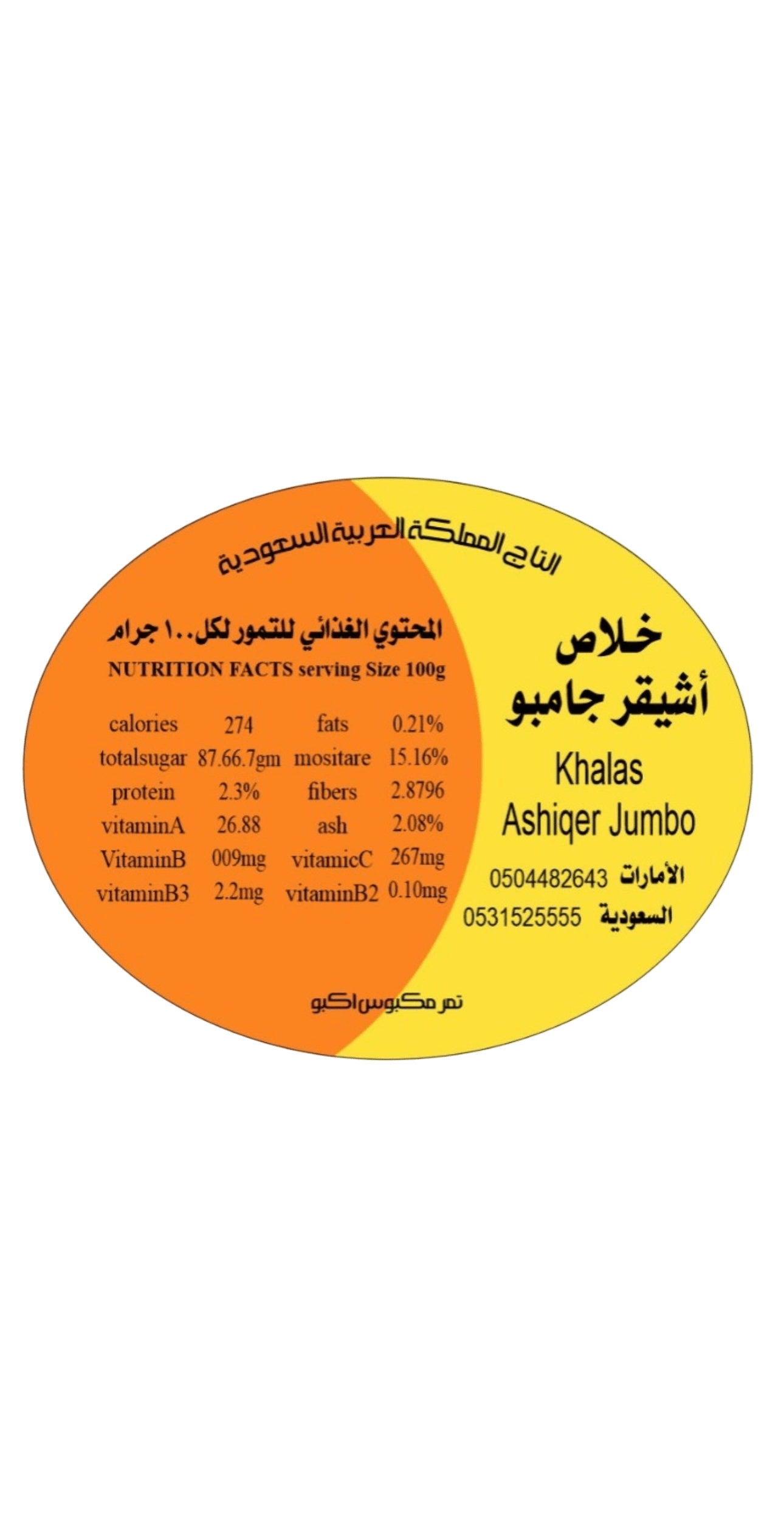 - جامبو: يشير إلى حجم التمر الكبير، مما يجعله خيارًا ممتازًا للوجبات الخفيفة الفاخرة أو كوجبة ضيافة.